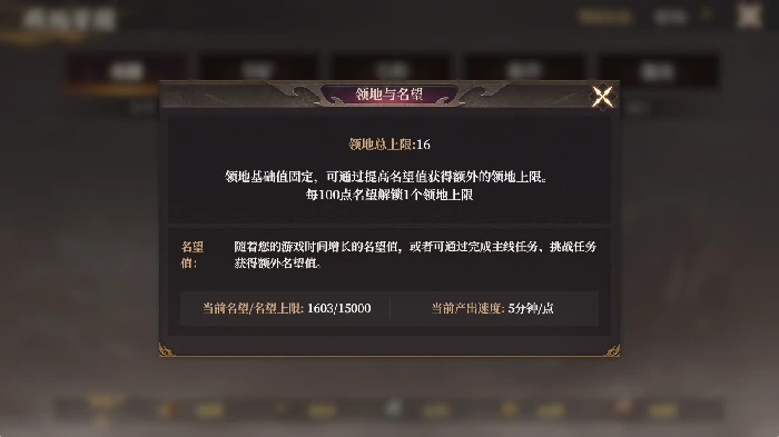 完成主线与挑战任务获名望值,名望值随时间自然增长。攻占和持有领地提升势力值。