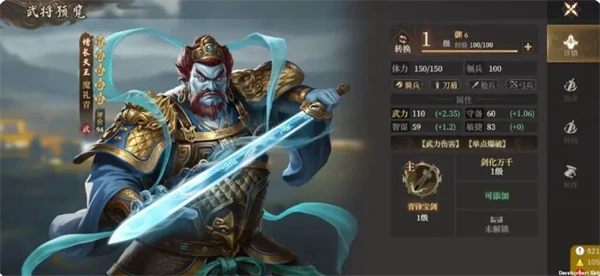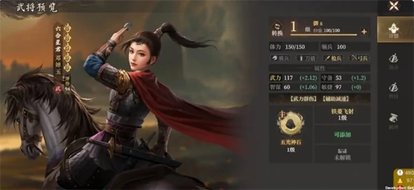 邓婵玉(控场与输出兼备):泛用型武将,有群体伤害与减速能力。自带术法铁菱飞射,对目标及周围最多3个目标造成26%武力伤害,并附加一层减速。