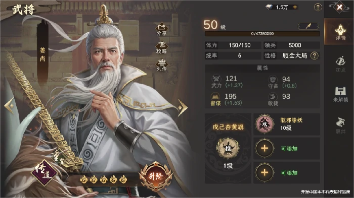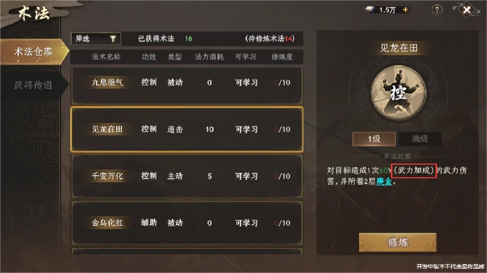 攒经验:术法经验分解低品质武将获取,珍贵!遗忘已升级术法损失20%经验,前期谨慎升级,暂升3 - 4级省资源。