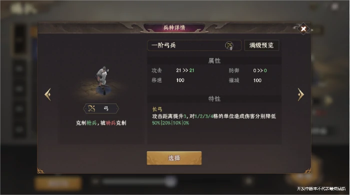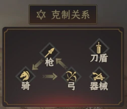 知特性:游戏有器械、刀盾、骑兵、弓兵、枪兵五类基础兵种。骑兵、弓兵、枪兵循环克制,刀盾与器械无克制但功能独特。