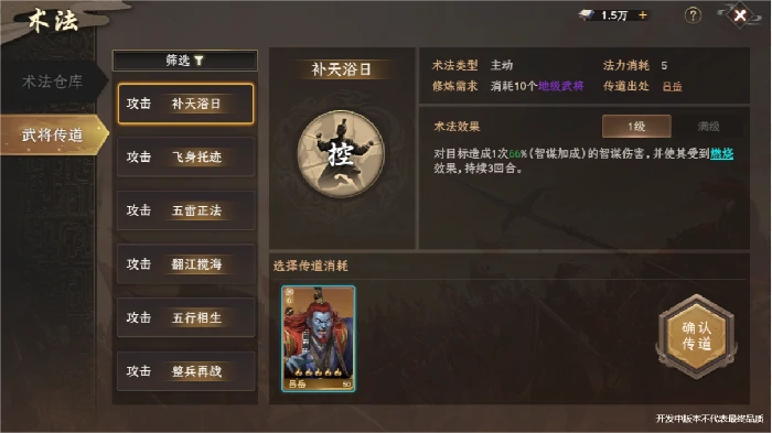 选术法:术法通过武将传道获取,消耗冗余武将换技能。选契合武将主属性术法,高谋略配谋略加成减伤技能,高武力配武力加成输出技能。