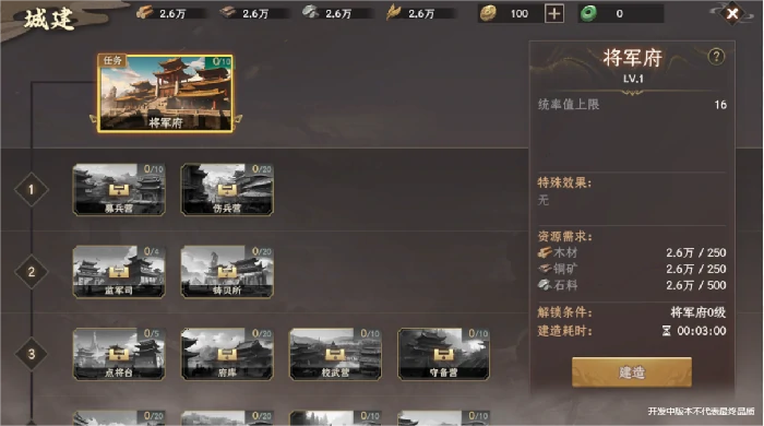 建府邸:府邸建设是前期核心,影响资源产量、队伍实力和主线进程。定期查建筑列表按需升级,保持将军府等级,提统率上限和发展速度。