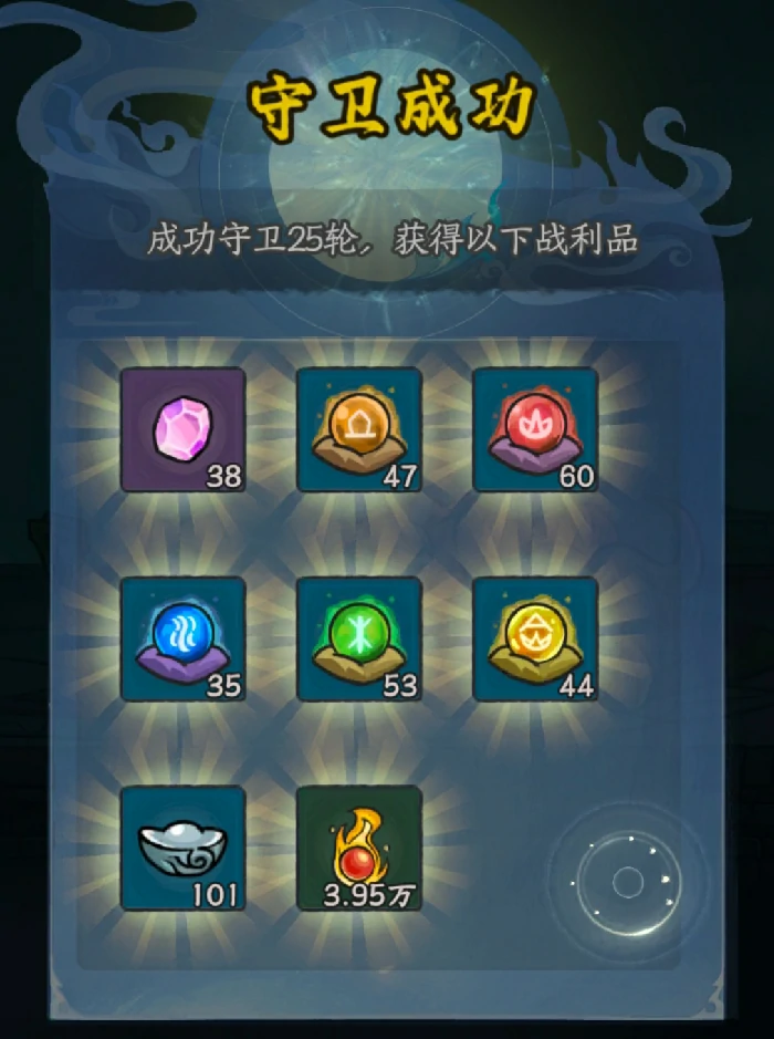 主要奖励:大量人物经验、灵符袋(第二十一洞天前掉落,用于功法领悟与重置)、五行内丹袋(第二十一洞天起掉落,用于五行熔炼与命盘提升)、灵石袋。