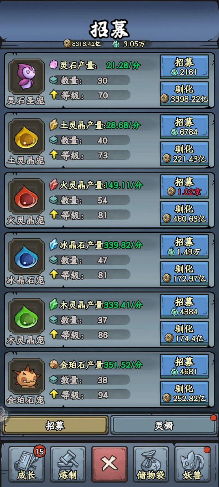 游戏前期用铜币招募灵宠,进度推进后成本高,依赖幼灵招募。前期均衡培养各类灵宠,中后期集中资源培养木、冰、火、土四类灵宠,后期需求大且资源采集难。