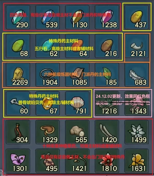 3. 材料数量影响成丹结果。比如9个贝壳和1个羽毛,成丹受贝壳影响超90%。要稳定获某类丹药,主材料数量别少于辅材料,甚至可不使用辅材料。如炼特殊丹药可用9贝壳+9蘑菇;炼宗门丹药可用9松油+9兽皮+9蘑菇+9草药;炼常用丹药某两种可用9茯苓+9雪莲花+9蘑菇+9草药。丹方不唯一,可自行找经济搭配。