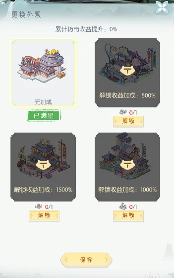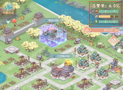 点单个建筑升级或升星提繁荣度,还能换外观、调布局,打造个性化坊市。