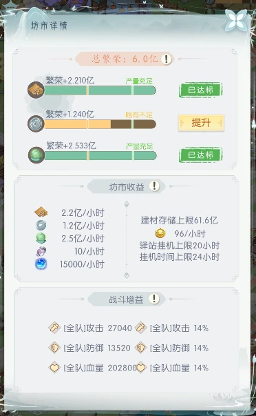 繁荣度影响每小时挂机资源产量,点右上角繁荣度区域查详细数据。总繁荣度由木材、银两和卡牌经验构成,对应各自每小时产量。