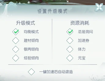 点建造按钮进快速升级界面,用一键升级自动操作,通过设置按钮自定义升级策略。