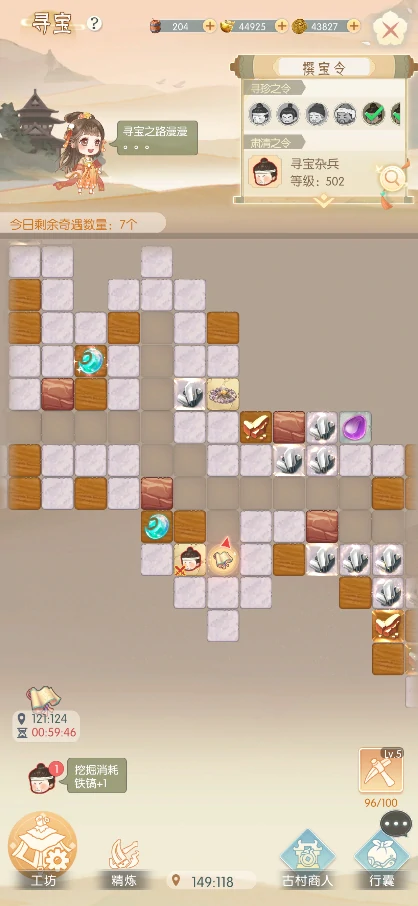 成为秘宝司女史,深入西域寻宝!点击地图区块,消耗矿镐发掘矿石与宝石,触发随机事件。