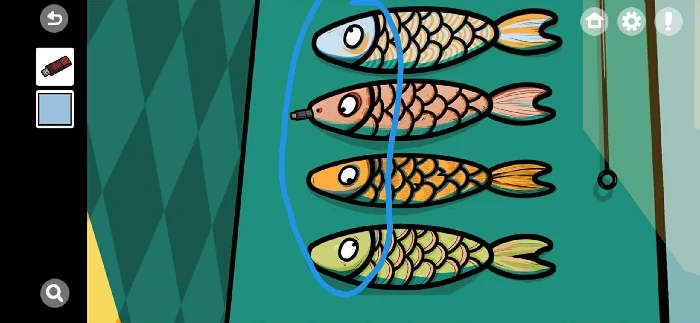 放下幕布,点击鱼标本,按顺序点鱼眼,拿另一个U盘。
