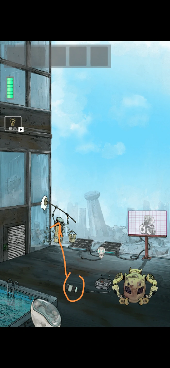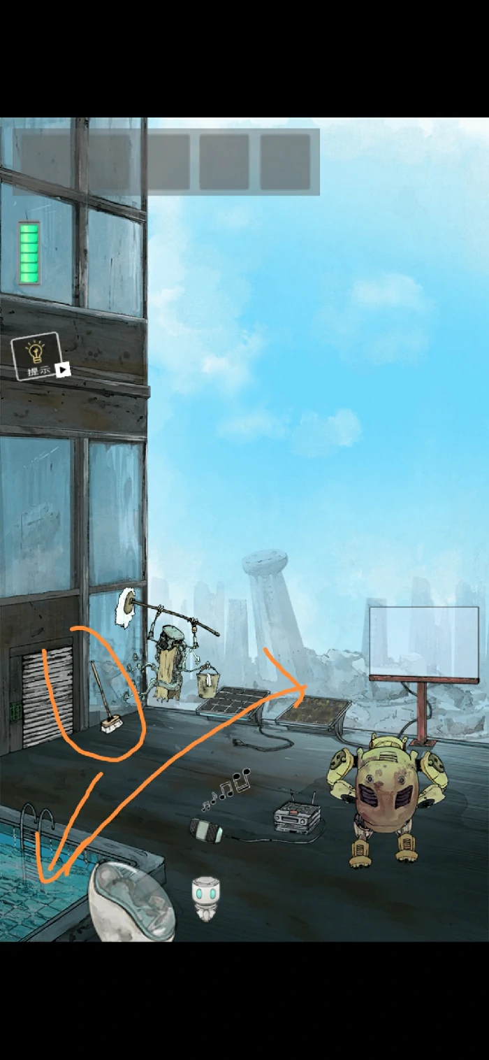 取拖把,沾水清洁太阳能板,拿喇叭装到清洁机器人,听口哨得密码831313,输入进场景四