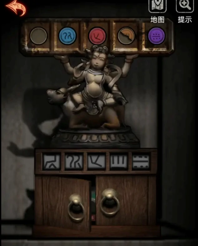 返回2009号病房,在柜子找颜色机关装置。若记忆不清,参考墙上画作颜色顺序:绿、蓝、红、橙、紫。已获红色与紫色按钮,另两个结合CT图案:长发“不”字对应橙色按钮,三条竖线加横线对应残缺按钮。按顺序调整,下方柜门开启,获石头道具。