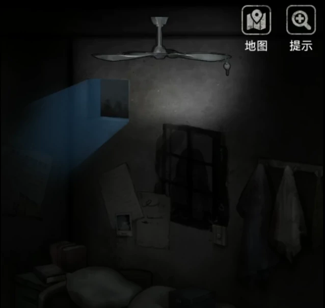 再调镜片照射方向,光线聚焦墙上海报右下角电扇开关。点击开关,风扇转动,听钥匙落地声。