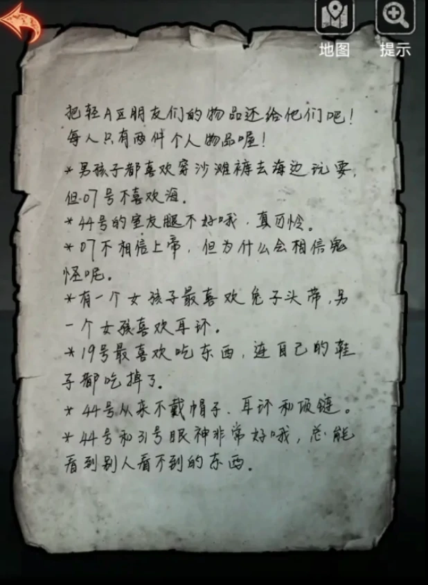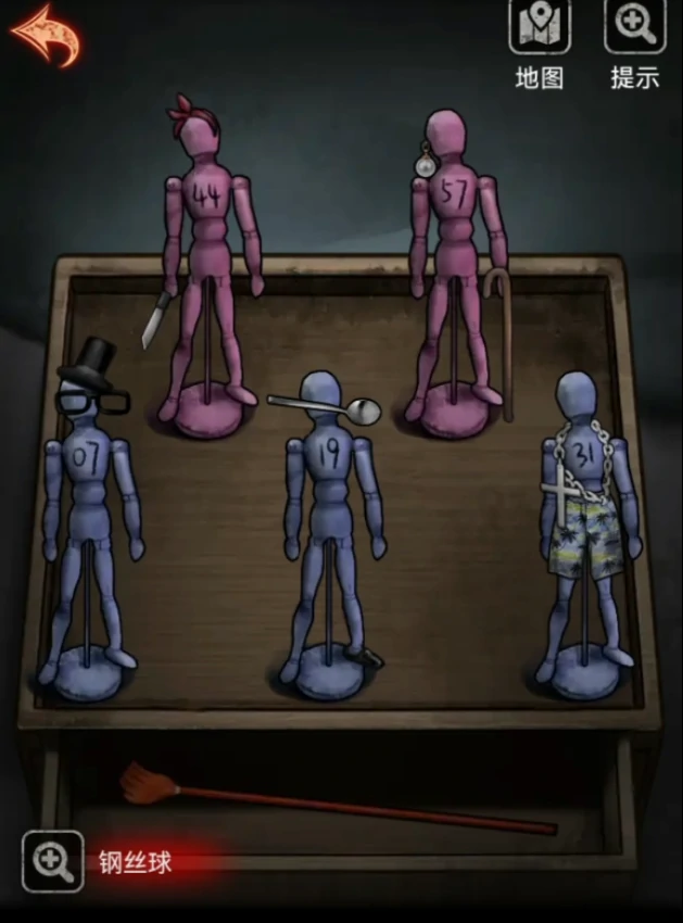 用钥匙进娱乐室,解谜墙上小人机关。根据纸条提示:44号戴兔子头带(非耳环/项链)、57号持手杖、7号排除沙滩裤与项链、19号持勺与鞋、31号穿沙滩裤戴项链、7号戴帽与眼镜、44号持刀。正确配置,获痒痒挠。