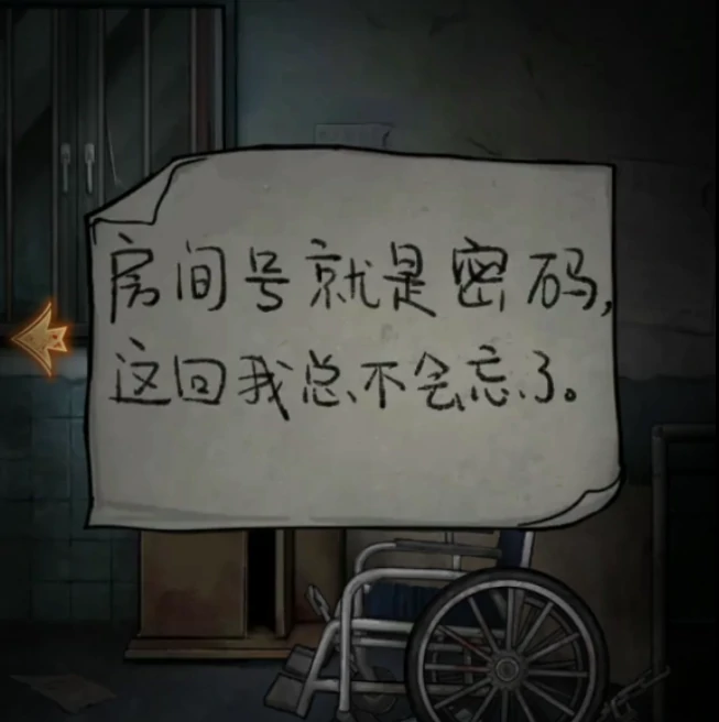 用钥匙解锁轮椅锁链,推动轮椅露出病号服,其上挂标有“2011”的病房钥匙。拾取钥匙前留意病号服编号44,后续会用。用钥匙打开病房大门,进入第一章主线。