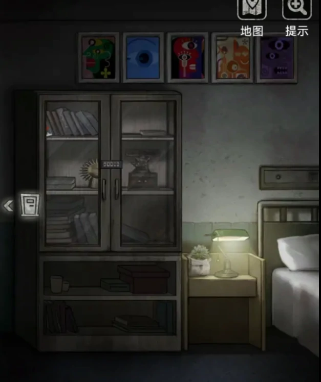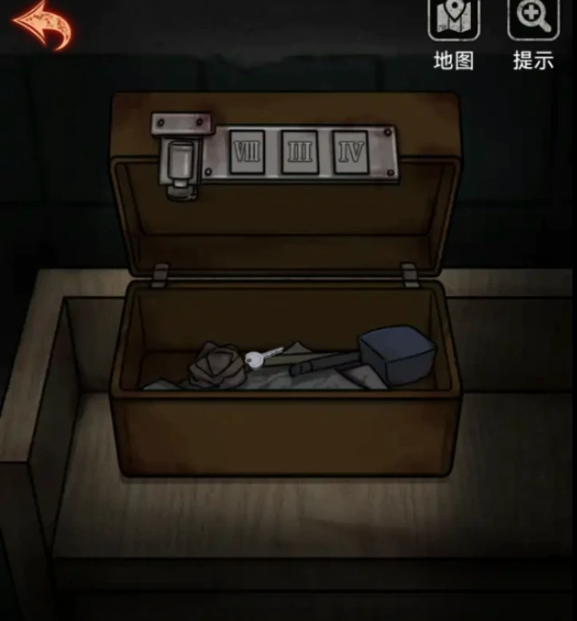 右下角四位密码箱,输入2011开启,获口红一支。回抽屉处,用口红涂抹内侧模糊处,显示三位罗马数字密码“834”。调整床头柜上方罗马数字密码锁为834,打开后取得钥匙。