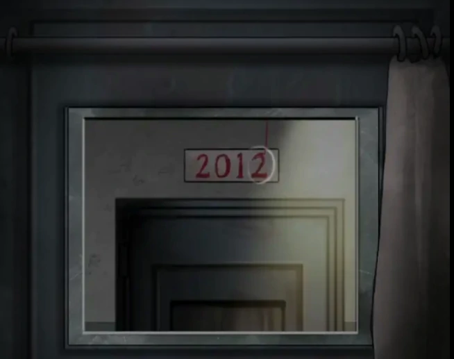 向右移至床头,发现小纸条,内容提示“房间号即密码”,先记下房间号。返回左侧门场景,掀开门帘(有轻微惊吓效果),对面房间号2012,推断当前房间为2011或2013。