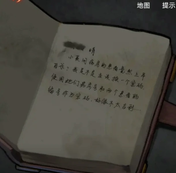 读日记知密码与小奚病房号及两名患者编号有关。已知病房号2011,一名患者编号44,还需另一名。勿直接组合,系统提示线索不足。调查至日记末页,拾取肖医生ID卡。