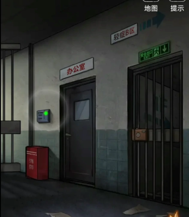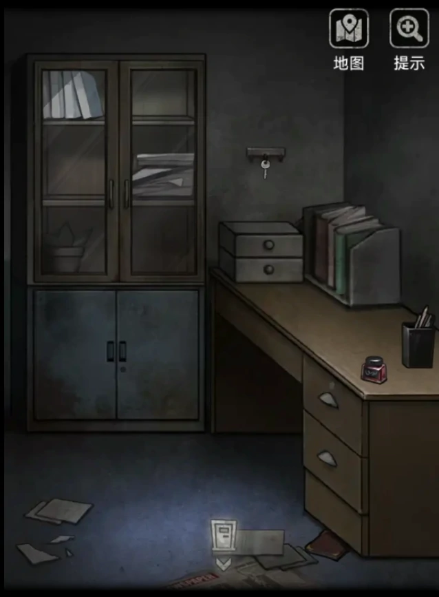 点击门触发剧情动画,离开病房。左转进唯一可进的办公室。进门后全面搜查:拾取桌子右下角红墨水、墙上钥匙、笔筒内圆珠笔。上方抽屉锁住,下方抽屉移开杂物得小零件与打火机。书架下方数字调整盒无线索,上方柜内有一叠病历,暂无法互动。