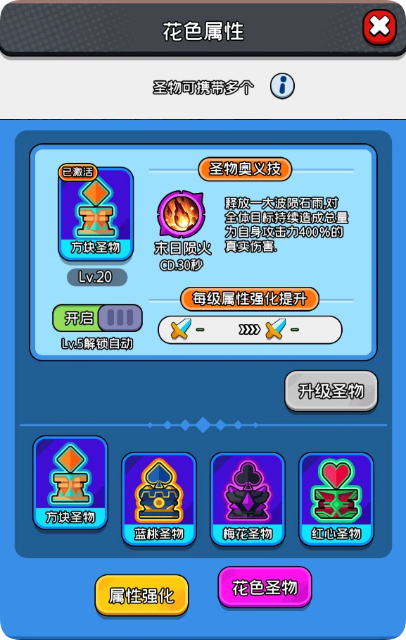 天天闯关中的花色属性,依赖刮刮卡中奖花色数量提升,是核心养成玩法。前期战略意义重大,能直接提升多项属性固定数值与百分比,还可解锁全新圣物技能。