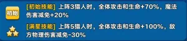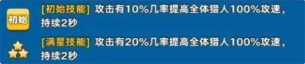 满星被动:伤害递增幅度(猎人数×4)%,满级(猎人数×6)%,切换目标增益不重置。