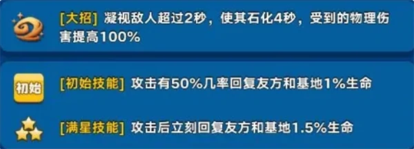 蛇女:用石化技能控制,打断敌方节奏,概率为基地及友军回血