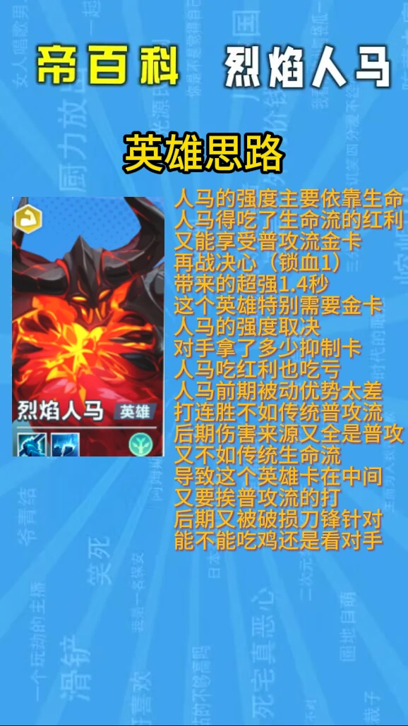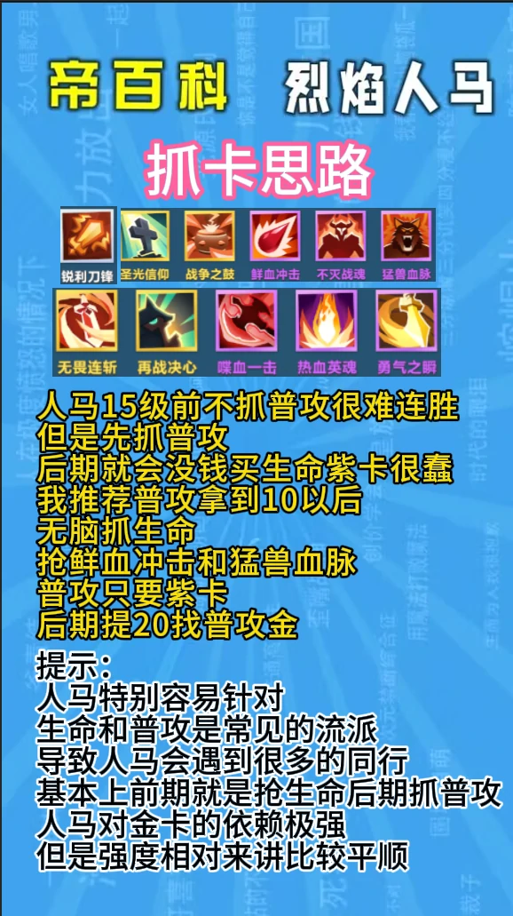 本期介绍以普攻输出为核心的烈焰人马玩法。火女加入、天鹰座未普及版本,人马是新手冲分首选。后来更多强力英雄推出,触发流玩法被开发,人马出场率下滑。但关键金卡到位,人马仍有争第一的实力。