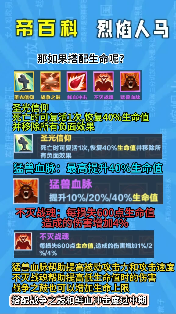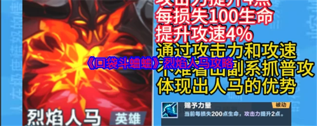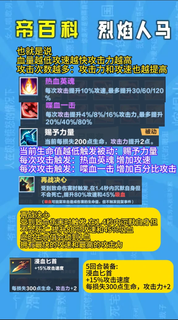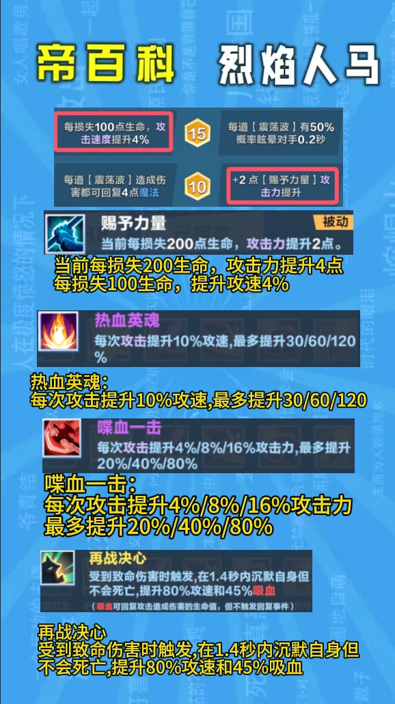 被动效果:每损失200点生命值,攻击力提高4点;每损失100点生命值,攻击速度提高4%。