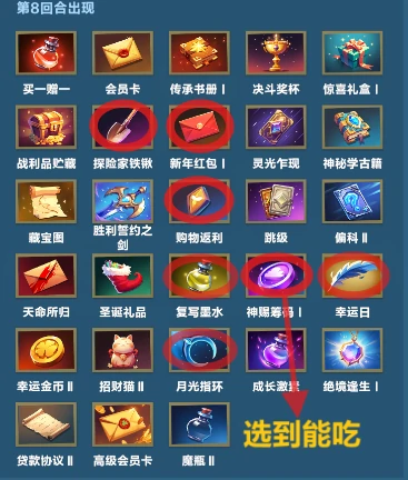 第13回合选蛛网斗篷、万能药水、治疗药剂、魅影之纱等生存向神器。