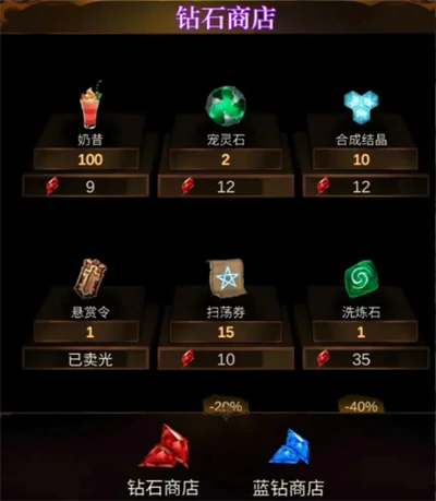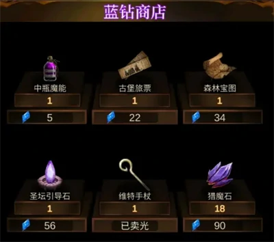 蓝钻商店(原勋章商店):公测后华尔德宝箱取消限购,优先购买维特手杖。宝箱与宝石类商品按需购置,装备未满前耐力宝石必买。