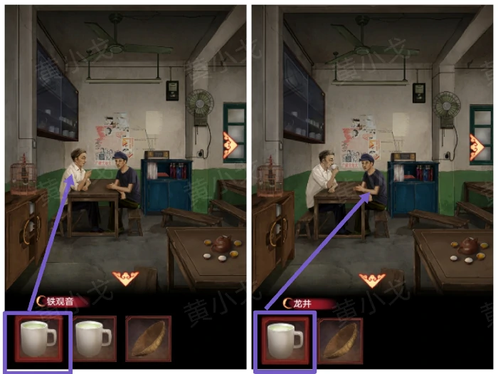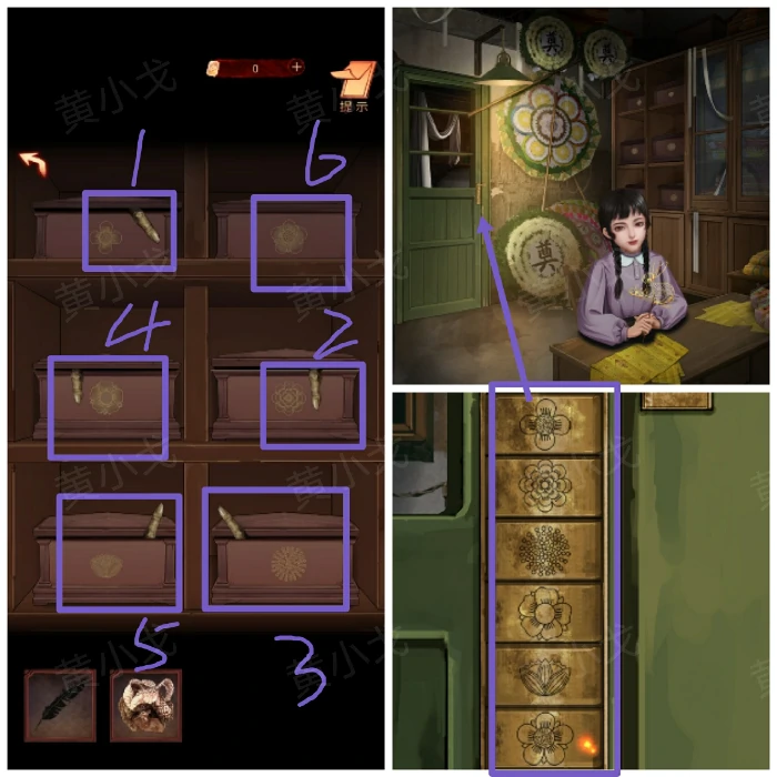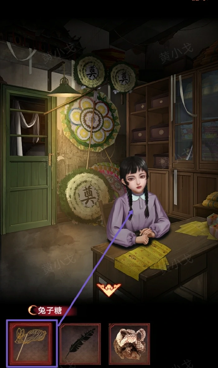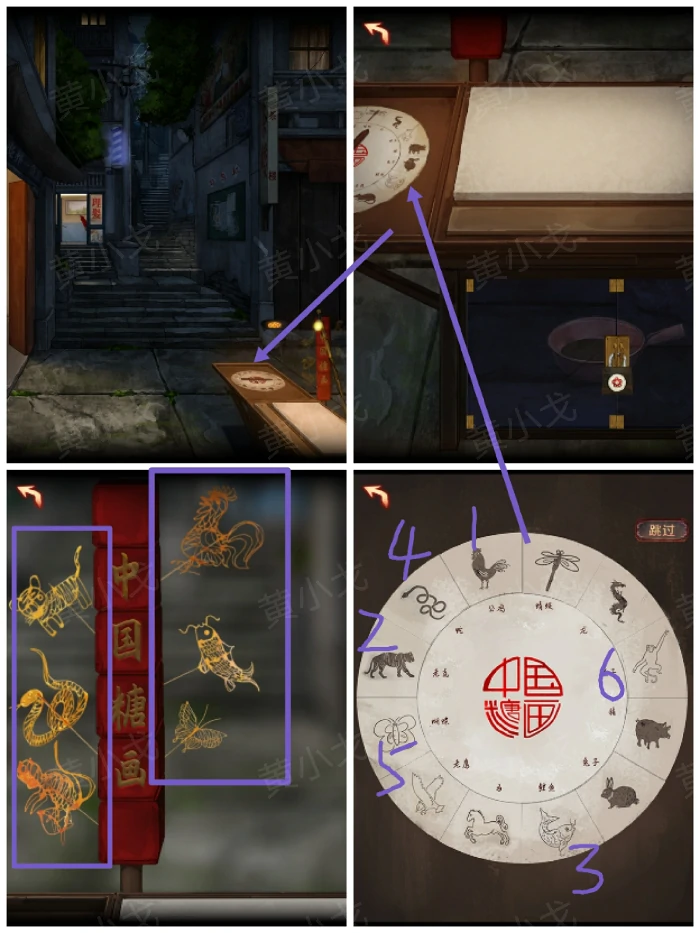 15. 进丧葬店触发剧情,观察糖画摊样品,记录顺序:鸡、虎、鱼、蛇、蝶、猴