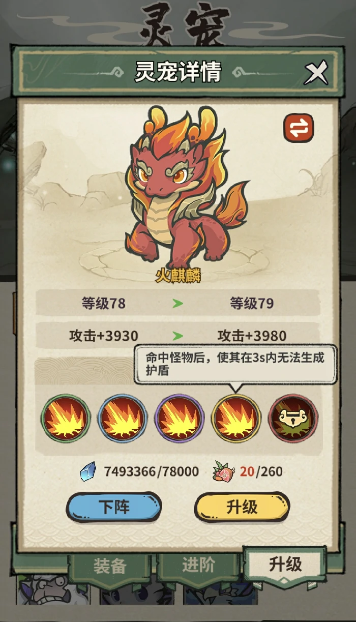 培养火麒麟,它是当前最值得获取的灵宠,无论什么流派都优先选它。火麒麟初始品质紫色,升至橙色解锁核心技能“命中目标后3秒内无法生成护盾”,克制高护盾怪物,改善推关体验。