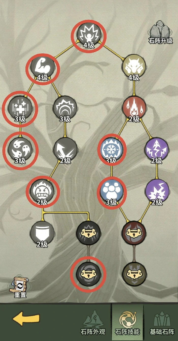 优先升级石阵系统中标注的关键技能。纯伤害型或触发概率类技能稳定性差,前期别投入过多补天石,资源充裕后再考虑。
