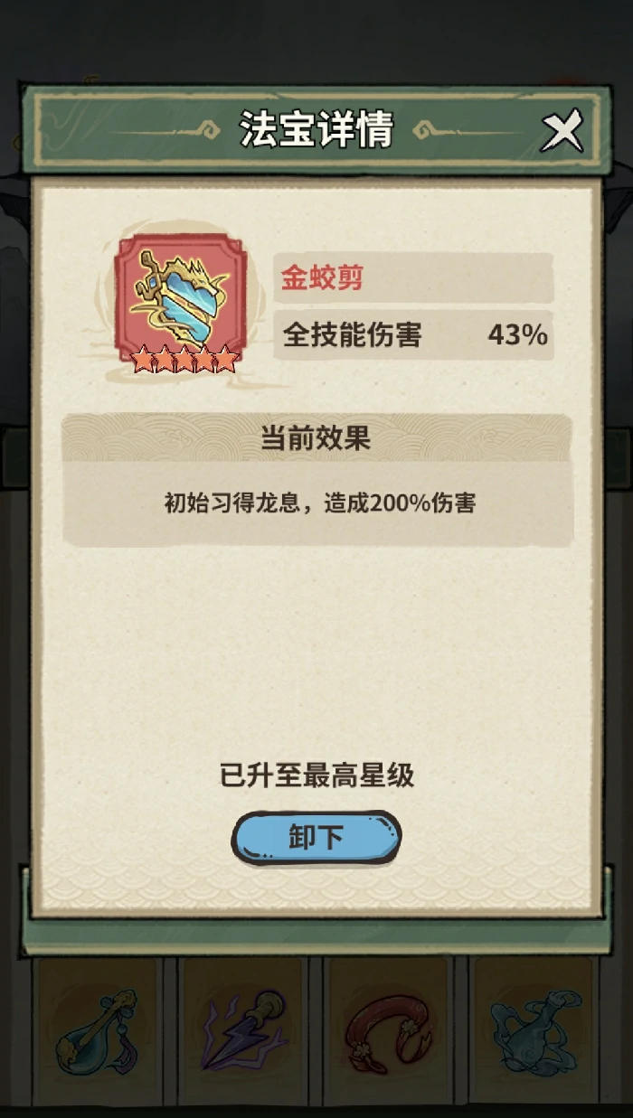 法宝能提前带指定技能进关卡,把一阶技能换为其他属性。开局一阶技能是飞鹰,换技能要装备对应系橙色法宝(一阶法宝仅带一个)。法宝还能给对应技能和全技能加伤害。
