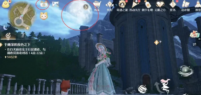 传送到花园镇的愿望梦境仓库旋廊,调时间到深夜,转身抬头见满月,拍摄即可。