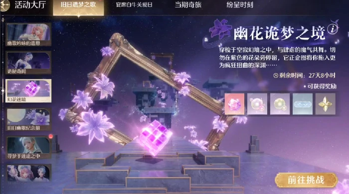 进活动大厅,选幻花迷境,完成一个关卡。此玩法清怪为主,节奏紧凑。