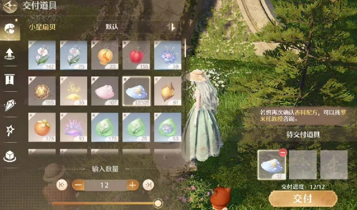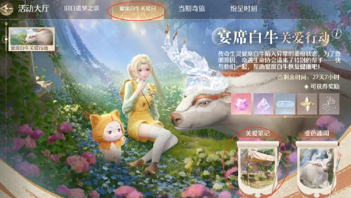 进活动大厅,接宴席白牛关爱笔记任务。到指定区域按提示制香薰瓶,配方可用特定时段植物、花粉、贝类或微风绿野果实等,每次投同一类道具12个。用斑斓舒心香薰瓶治疗白牛两次。