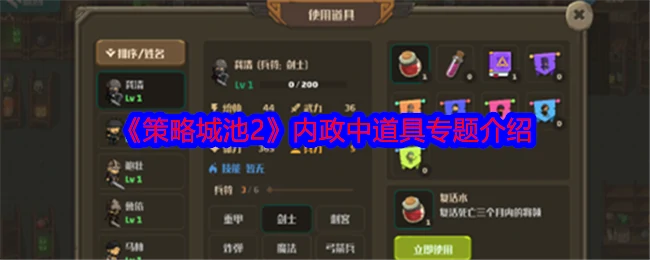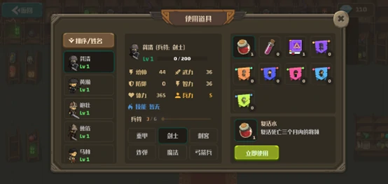 复活水:对我方战死将领用,若将领死亡时间在三个月内,使用可立即复活;超期限,将领永久消失。