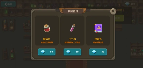 目前三种道具可用宝石买,分别是复活水、士气水和经验书。
