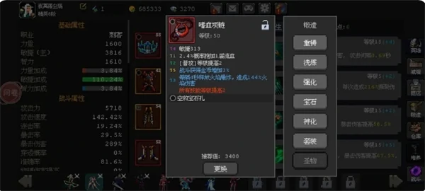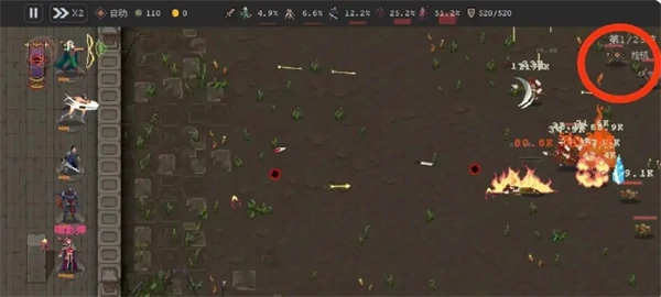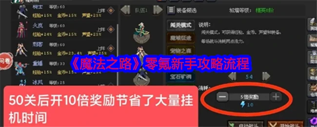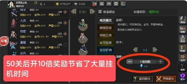 初期在第七关和第十关易卡关,退回前一关卡,开双倍收益刷装备和经验。关卡进度到50后,解锁高倍率挂机,提升效率。