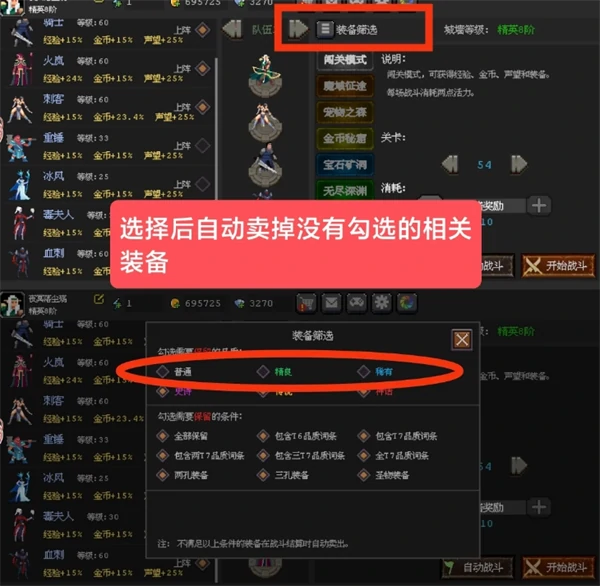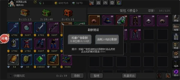背包容量小,定期清理。看广告扩充背包,结算前用装备筛选功能卖低品质装备。
