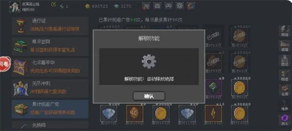 第二天看45次广告,解锁自动挂机功能,减轻操作负担。