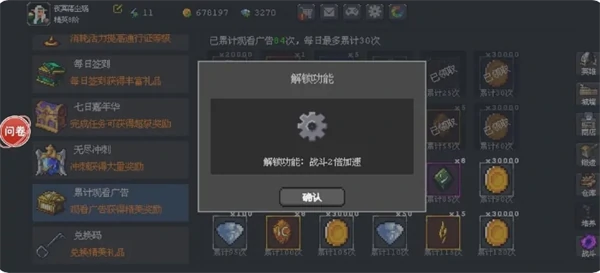 战斗界面左上角有加速功能,初始最高1.6倍。看20次广告解锁2倍速,节省推图时间。