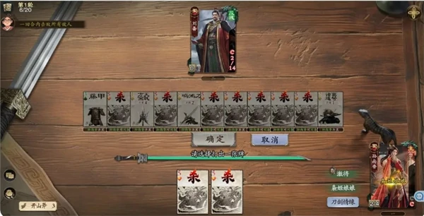 22装备开山斧和诸葛连弩;装备藤甲、鸣鸿刀、方天画戟(顺序不限),最后一件装备时弃一件非关键装备,保留开山斧和连弩;对刘备出杀,弃其余两装备触发开山斧增伤,触发连弩特效连续出杀,手牌剩1杀时弃连弩触发开山斧增伤;结算后,再对刘备出杀并弃1杀触发开山斧增伤,获胜。