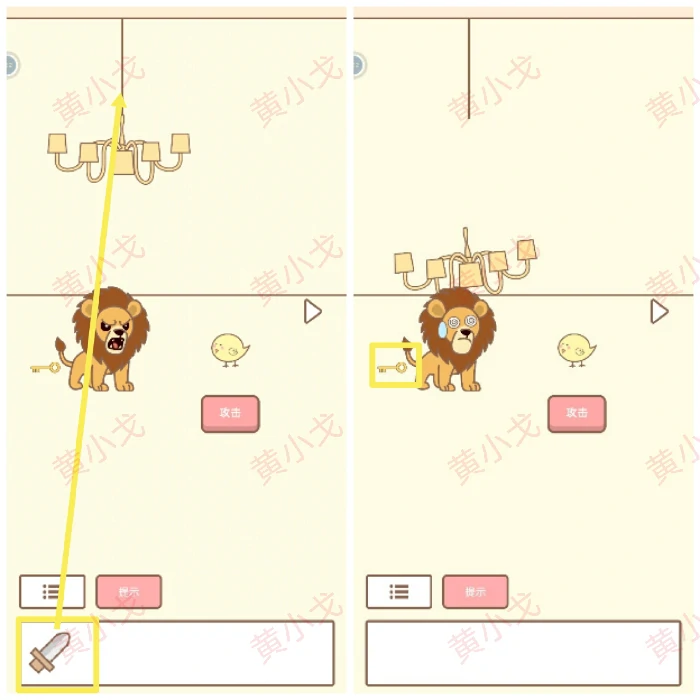 2. 用短剑切断吊灯上方绳子,等吊灯砸中狮子,拿钥匙