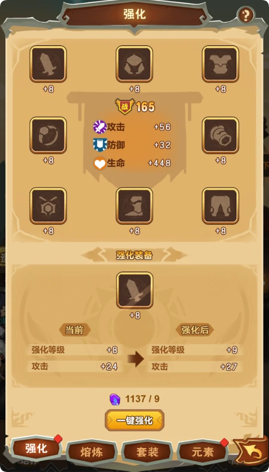 一、用强化石提升装备各项属性,强化等级越高,属性增幅越明显。