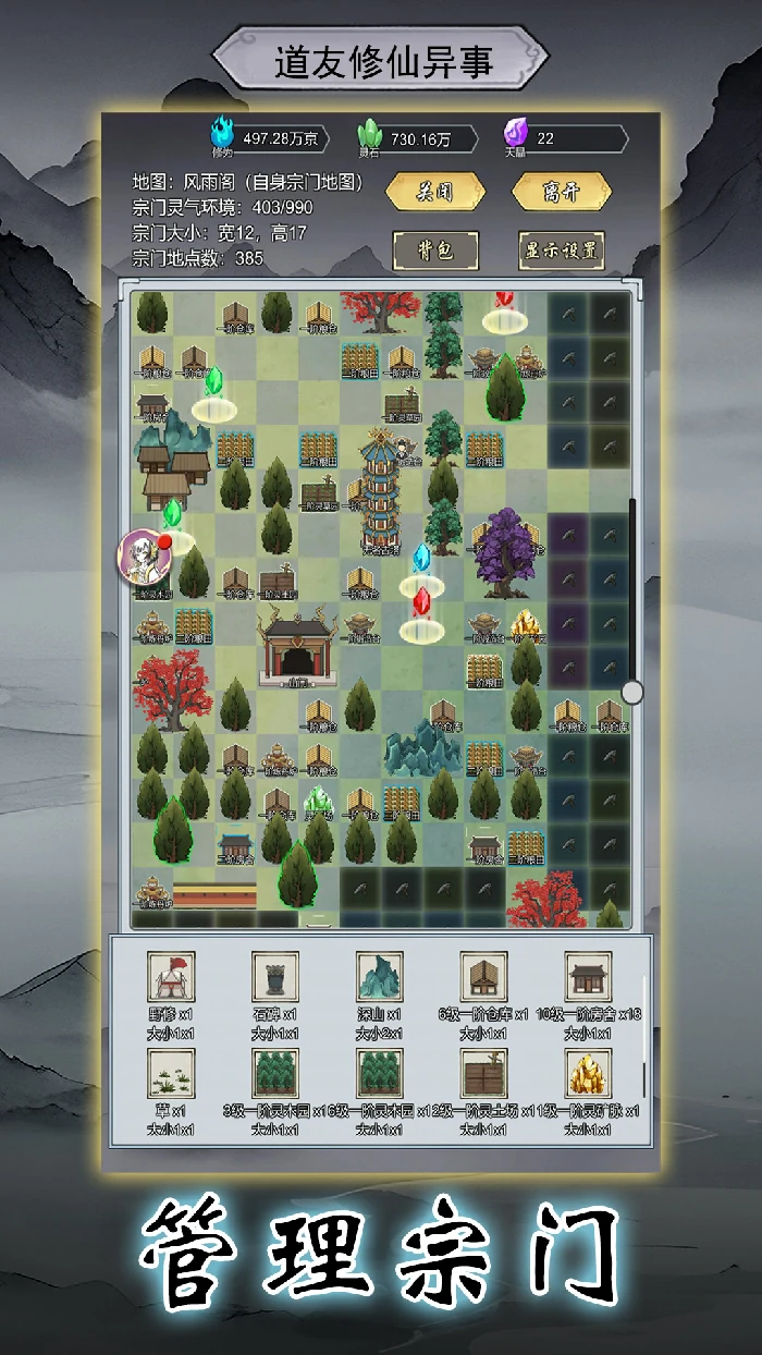自由布局建筑,如法阵、灵田、锻造炉、灵植;
