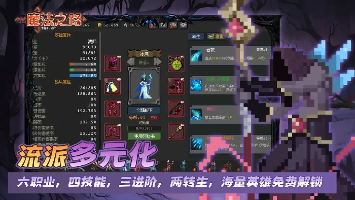 在魔法之路融合暗黑元素与像素美术的塔防游戏里,扮演冒险者,招募不同职业英雄,打造强力装备,搭配技能,抵抗怪物。