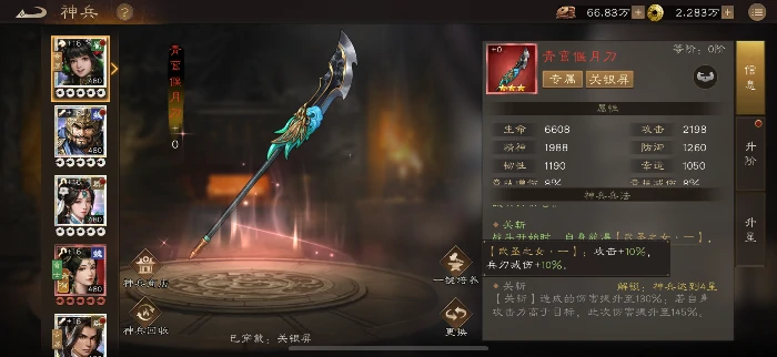 技能方面,“青龙斩击”可对直线三格冲锋,对路径首个敌人最高造成180%近战兵刃伤害,冲锋前获“强兵·一”状态,兵刃与谋略伤害提高20%,增益持续两回合,有突进破阵能力。“武圣遗风”消耗200点怒气,最高造成220%近战兵刃伤害,击败目标对周围生命最高单位追加110%伤害,未击杀目标,六星后仍触发额外伤害,残局或补刀实用。“偃月之阵”对目标最高造成185%近战兵刃伤害,自身攻击高于目标,暴击率提至25%,攻击范围扩展至周围一格,近身作战压制力强。