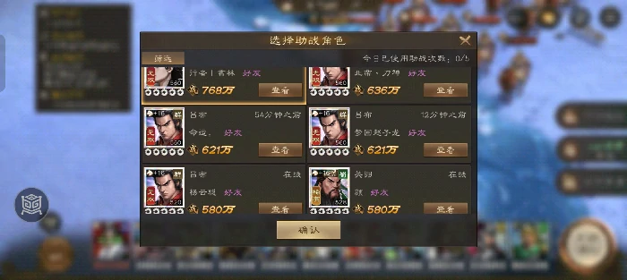 善用助战功能,点击开局界面左下角助战图标,借用大佬或好友强力武将。定期整理好友列表,多添加活跃度高、战力突出玩家。